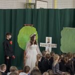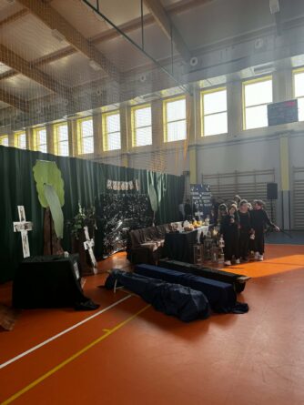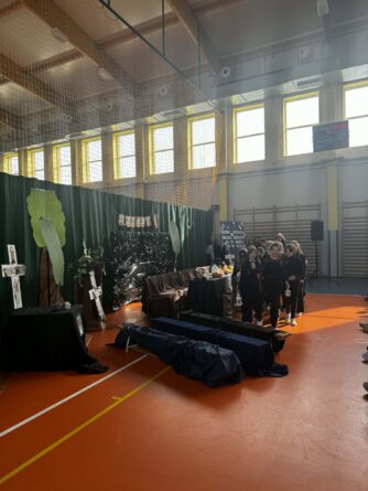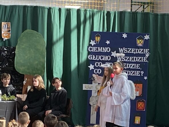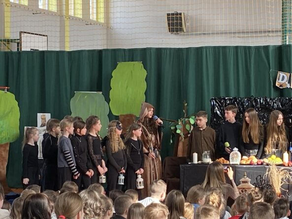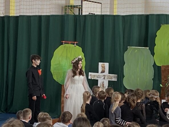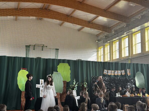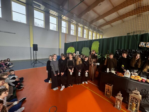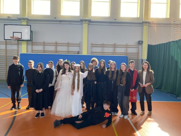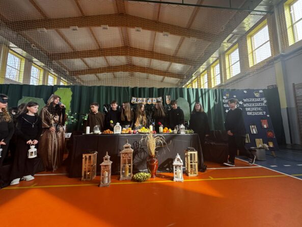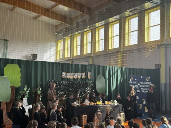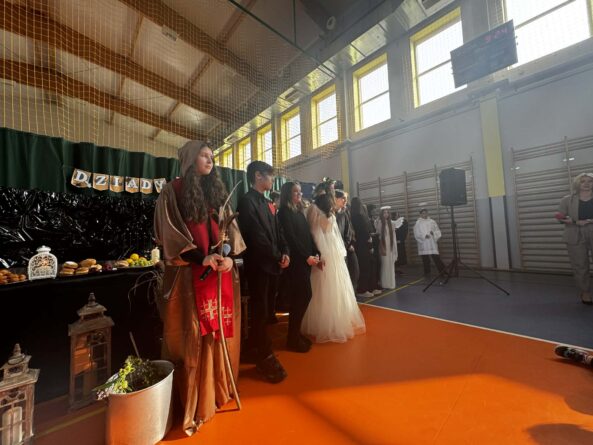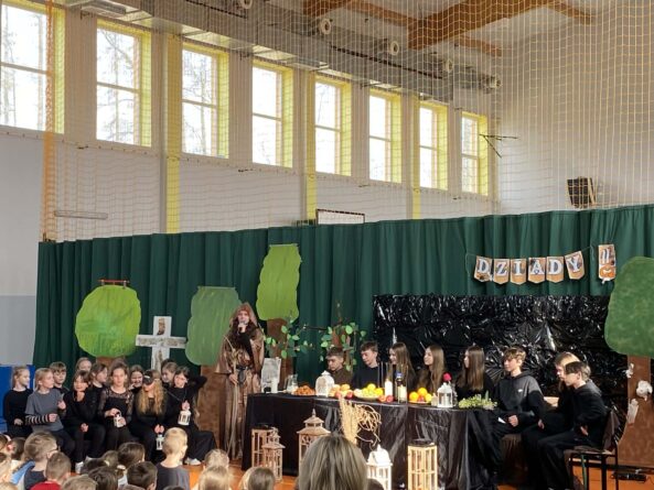31 marca uczniowie klasy VIIa i IIIa przy współpracy VIa przenieśli całą społeczność szkolną w scenerię pogańskiego zwyczaju dziadów , opartego na dramacie A. Mickiewicza, o tym samym tytule. W klimacie ekologicznym, przy blasku świec, zapachu kadzidła i mrocznej muzyce na scenę wyszedł chór ptaków nocnych z prowadzącym obrzęd Guślarzem, który kolejno zaczął przywoływać zmarłe dusze. Wśród zjaw pojawiły się duchy lekkie-aniołki Rózia i Józio, duch ciężki- widmo Złego Pana, duch średni- pasterka Zosia, a na końcu duch samobójcy. W trakcie biesiady padały różne prośby oraz zaklęcia i przestrogi dla żyjących. Oprawę wizualną ubogacała dekoracja ekologiczna nawiązująca do czasów pogańskich, przypominająca las, cmentarz i kaplicę. Spektakl niespodziewanie zakończył duch samobójcy, który na zawołanie chóru : „Co to będzie…?”, odpowiedział: „A teraz dzwonek na przerwę będzie”. Po przedstawieniu Pani Dyrektor zabrała głos, dziękując uczniom i nauczycielom za jego przygotowanie, ‘a następnie złożyła wszystkim życzenia na nadchodzące święta wielkanocne.